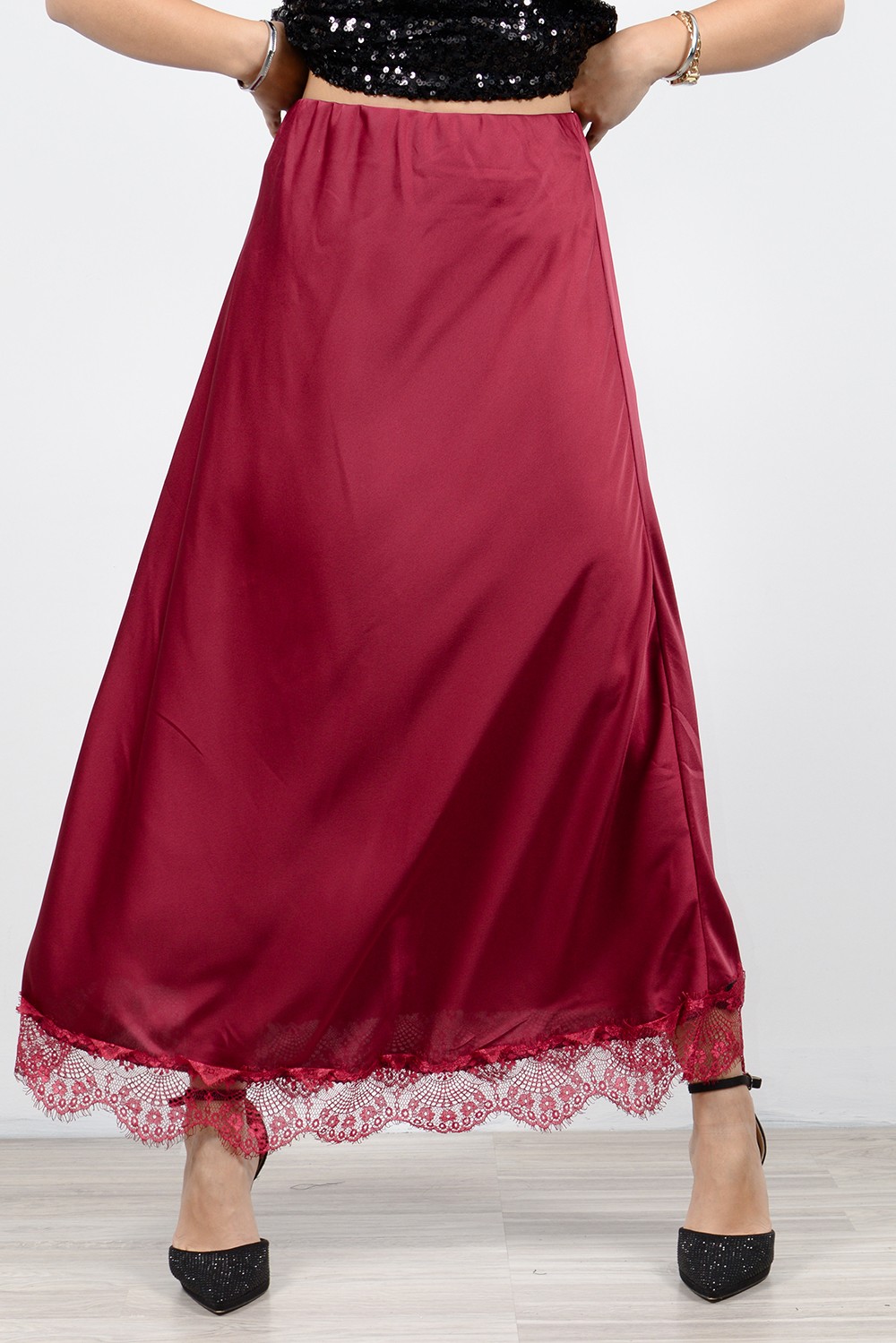 Maxi A-line skirt made from satin fabric in red color. It features an elastic waistband for a comfortable and secure fit. The hem is finished with lace detailing, adding a subtle textured element. Its clean silhouette and full length make it suitable for both everyday styling and more polished looks.