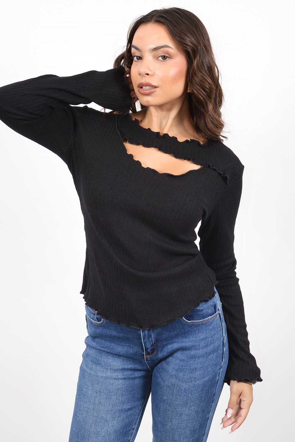 Black knitted top with a ribbed texture and cut out chest detail. Finished with a wavy hem at the neckline and cuffs for a feminine and trendy touch. Its slim fit enhances the silhouette while remaining comfortable. Perfect for both casual and evening outfits.